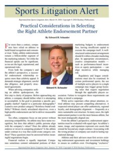 Ed Schauder, Special Counsel at Nason Yeager, was recently featured in Sports Litigation Alert. In the article, Ed examines key legal and strategic considerations in selecting the right athlete endorsement partner, including brand alignment, contract structure, financial diligence, and reputational risk management.